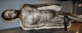 As we turned a corner in the exhibit space, Benjamin Entner’s giant, inflated nude male figure titles “Self Portrait on a Cold Day” was a delightful artistic discovery. His piece really intrigued me since I have spent many years creating my own 3-dimensional stuffed pieces I’ve painted and drawn on — similar to Entner’s technique.