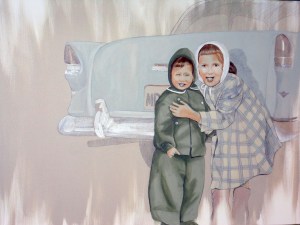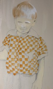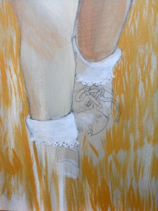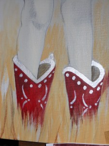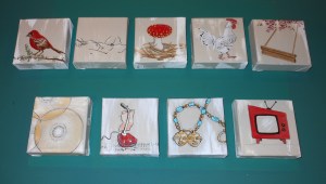 Since my paints were out anyway, and I was required to make something for a little gift exchange with all the other students in Senior Seminar, I decided to make everyone a little painting. I love working with the pre-stretched one inch thick canvases. For this series of thank you gifts I bought the 5″ x 5″ size. It will be interesting to see what each person thinks of their painting I made specifically for them. Each painting is of something having to do with that person’s artwork they made for their senior thesis show, except Janelle’s. She said she likes birds, so I painted her a bird instead of a wax-dipped-tea-stained pouch.